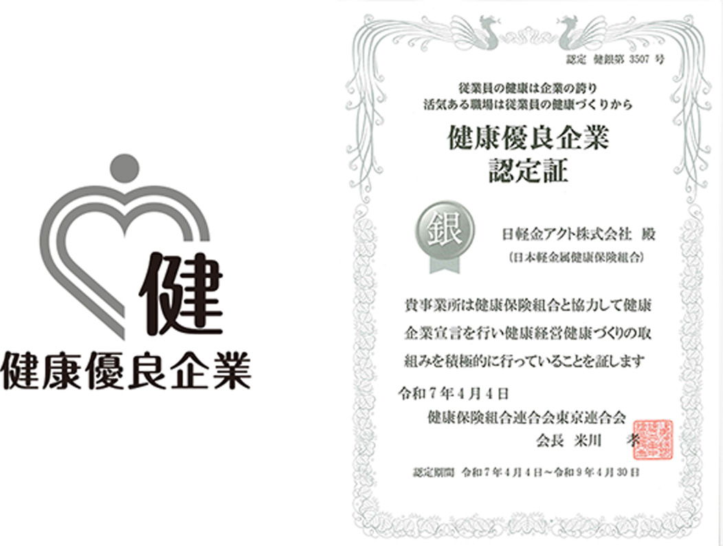 日軽金アクト株式会社は、健康保険組合連合会東京連合会へ「健康企業宣言」を行い2025年4月に健康優良企業「銀の認定」を取得いたしました。(健康優良企業認定番号:健銀第3507号)