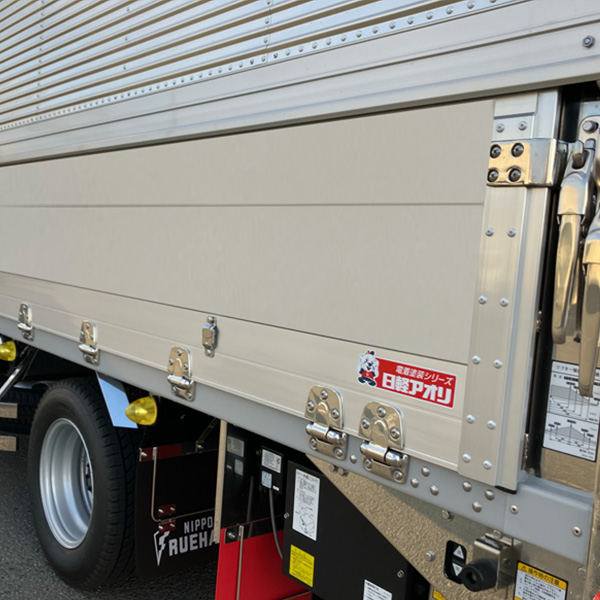 トラックのアオリは荷台の積載物落下防止のための囲いとして用いられます。日軽アオリはアルミの素地を活かした電着クリア塗装により美観に優れております。弊社アルミアオリはトラックの軽量性に貢献しております。