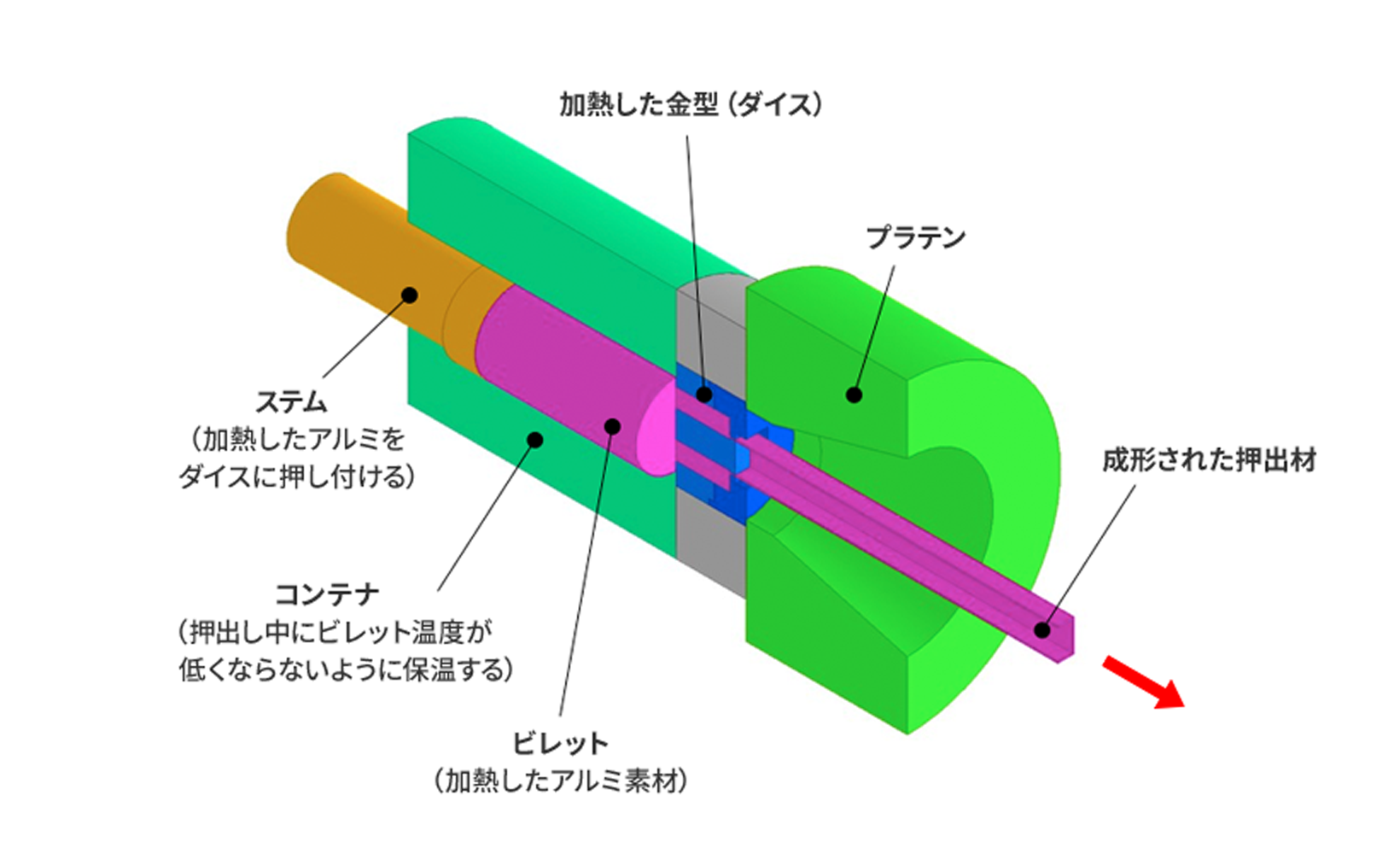 - ビレットが低温になると押出できないため、コンテナは常時保温されます。