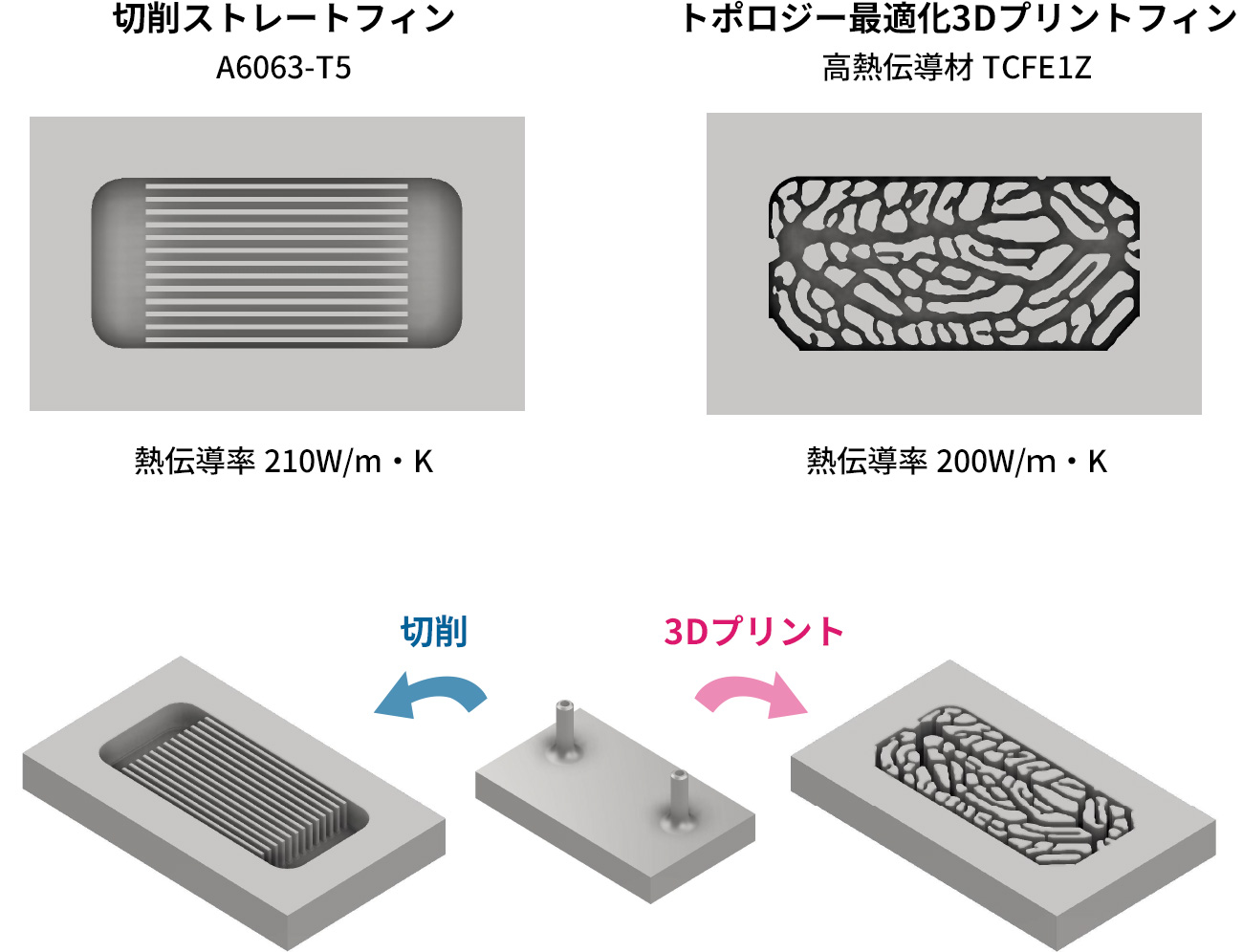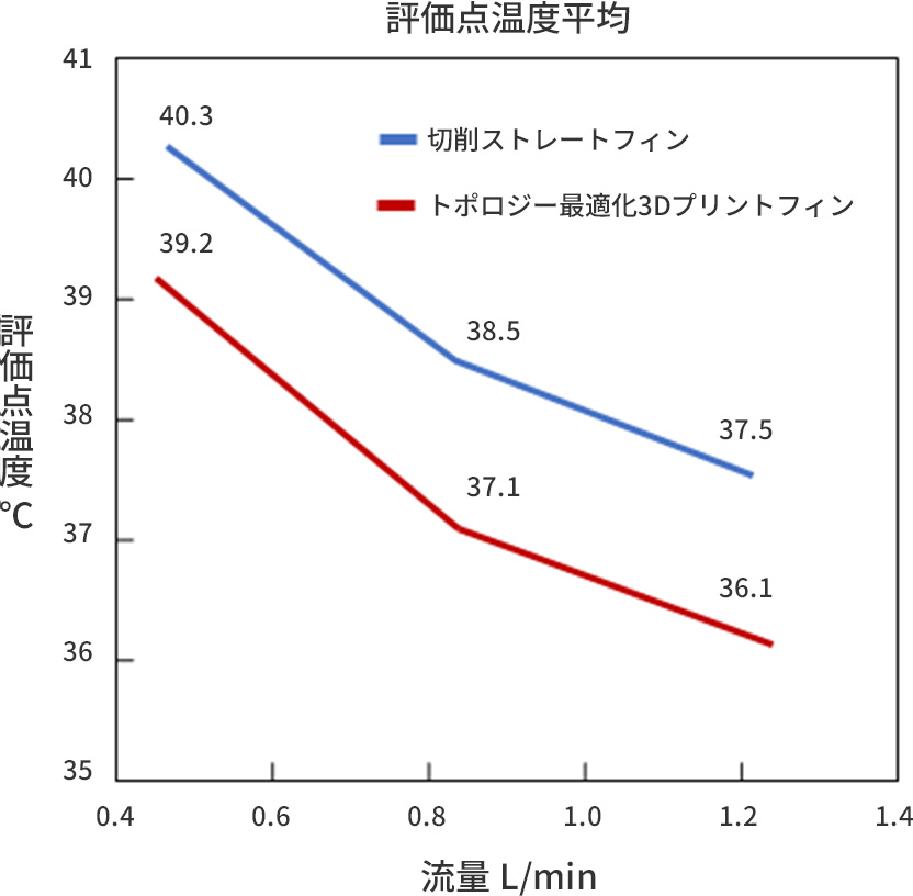 切削ストレートフィンとトポロジー最適化3Dプリントフィンの性能比較
