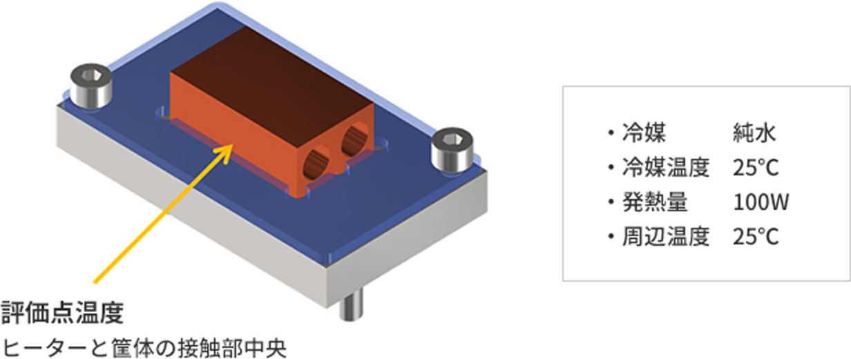 ヒーター熱源で100W印加25℃純水を流量変化させて熱電対で温度測定各モデルの冷却性能を比較